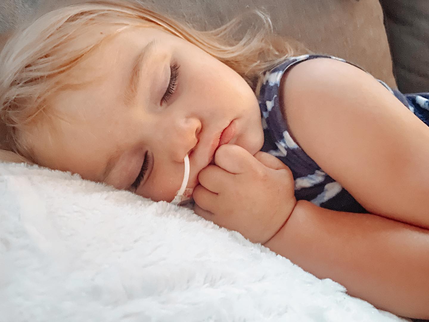 Mesmo pequena, tentava puxar o tubo no começo — curiosa, sem entender por que aquilo estava ali.